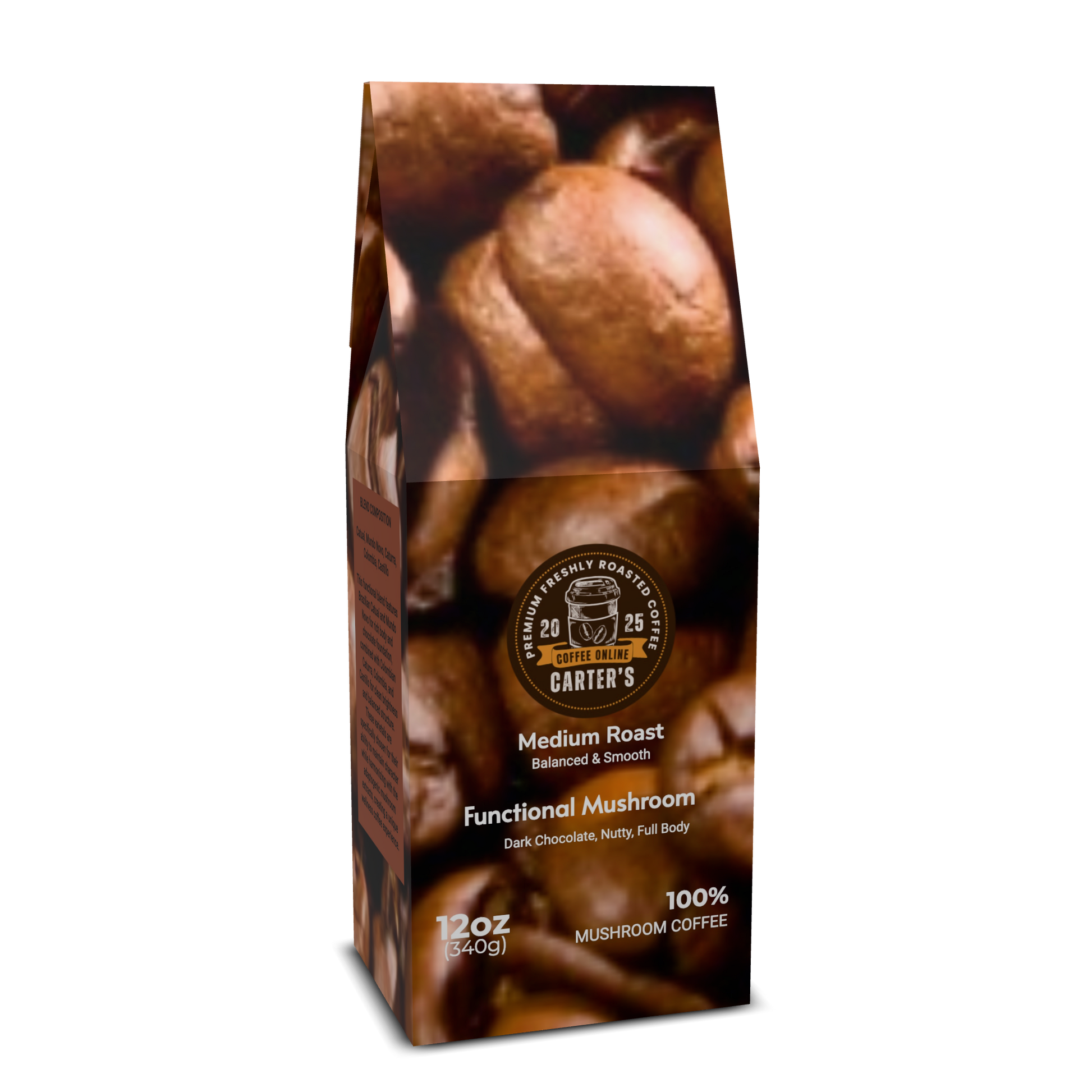 A unique functional coffee blend combining premium coffee with adaptogenic Lion’s Mane and Chaga mushroom powder. This innovative blend delivers rich coffee flavor enhanced with the wellness benefits of carefully selected mushroom extracts, creating a balanced and energizing cup.